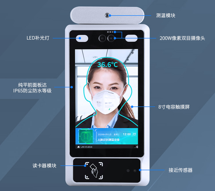8寸人臉識(shí)別測(cè)溫終端,融合人臉識(shí)別算法,在機(jī)器視覺(jué)、大數(shù)據(jù)和云計(jì)算等技術(shù)的加持下,能實(shí)現(xiàn)精準(zhǔn)識(shí)別、無(wú)接觸式測(cè)溫,滿足人員出入身份核驗(yàn)、行程記錄、體溫監(jiān)測(cè)等工作需要,且可以7X24小時(shí)不間斷運(yùn)行,體溫異常觸發(fā)警報(bào)。
