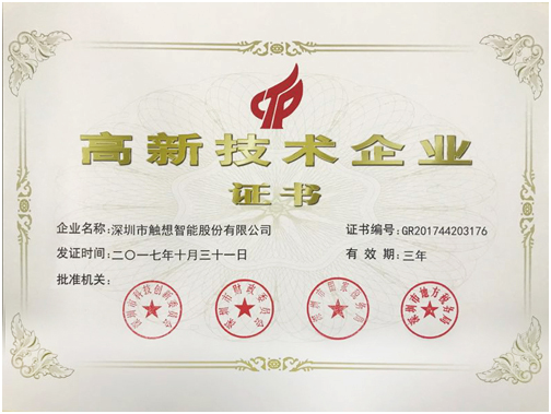 觸想智能順利通過國家級高新技術企業認定,證實了公司在研發投入、核心自主知識產權、科技成果轉換、研發團隊實力等的綜合實力,同時也體現了政府及社會各界對觸想智能在工控顯示設備行業辛勤耕耘的認可。